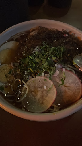 El Ramen Sonorense me parece ser un platillo nuevo en la carta, el caldo era un consomé de res un poco suave con algo de salsa de soya, me hubiera gustado más si se sirviera más caliente, pero me llegó algo tibio. El huevo yo recomiendo que lo marinen para servirlo, tendría un mejor sabor además de que complementaria mejor al plato como un ramen, las yemas estaban muy cocidas, los fideos estaban normales, lo que más destaca del plato es la carne de la ramos.