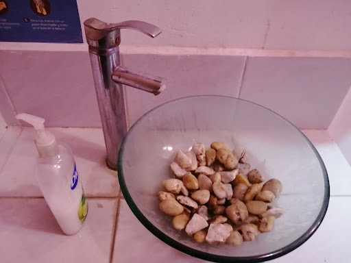Otra cosa más, se me hace totalmente falto de higiene que tengan el lavabo con piedritas decorativas. No me quiero imaginar si tienen un comensal que, le valga la vida y se enjuague la boca y escupa allí......