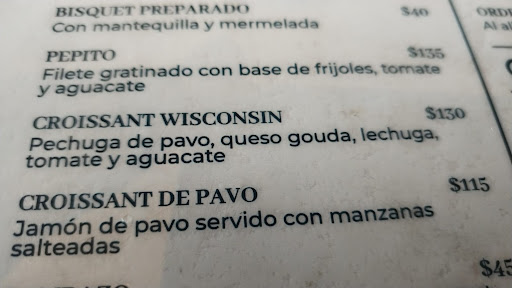 Read morePedí un croissant que en el menú decía que llevaba lechuga, jitomate y aguacate y me entregaron un croissant con jitomate y arándanos amargos,les comenté que en el menú viene especificado lo que debe llevar,sin embargo solo le agregaron queso.Decidi pagar e irme ,ya no reclamé ni toque el platillo en caso de que le haya escupido. Pero creo es importante actualicen el menú y pongan que ingredientes...