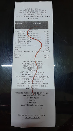 Read morePor qué 3 estrellas por qué compra un paquete de 16pz o cualquier especialidad vas Aver la diferencia entre una pierna GRANDE y una chica. Vas con el fin de pedir arroz de complemento y otra vez si no hay arroz, no hay puré, o para variar otro tipo de especialidades que maneja. esta cadena señores nos dan lo que quieren que nuestro dinero no vale o que. No creo que no tengan un estudio de mercado tecnia o que vean por sus ventas que día son los que se venden bien obvio los fines de semana y las quincenas. Es cuestión de prepararse muy bien, Para el tipo de ventas que deben de tener con los clientes. O Por qué no somos de Estados Unidos. Créan o no allá si hacen esto. estaría demandados uno por los clientes otro controles de calidad o verificación están vigilando estos tipos de tiendas y las clausuran o les restringen su permiso. Bueno es mi punto de vista, pero que podemos hacer. si aquí con $500 pesos compras al de Profeco. Pero bueno estamos en México y aquí...