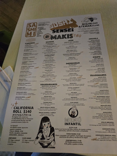 Read moreHace unos años este era de mis lugares favoritos de sushi y la verdad hace unos 3 años no regresaba a una sucursal. Ayer fue el día y la verdad ha decaído bastante. Lo único rescatable fue la atención eficiente y amable de los meseros, de ahí en fuera todo bastante mediocre: 1. El queso manchego de los kushiagues estaba duro y se sentía viejo 2. El aguacate que estaba por fuera de mi rollo de sushi era de un color café amarillento (se nota que usaron aguacates golpeados y en mal estado) 3. Las tiras de pollo panko todas tiesas, con sabor a aceite súper reutilizado y el pollo duro e insípido 4. Las cervezas no estaban frías 5. El botecito de salsa unagui que nos dieron estaba todo sucio, grasoso y con la etiqueta ya desprendiéndose de tanto uso y mugre… Obviamente jamás regresaré a un Sensei, y sí, los precios son bastante económicos pero prefiero pagar...