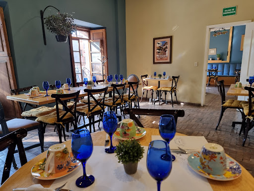 Las mesas están dispuestas con una atención meticulosa al detalle. Los manteles blancos proporcionan un contraste limpio y elegante con la loza colorida y las copas azules. Cada lugar está cuidadosamente arreglado, lo que demuestra un compromiso con la estética y la satisfacción del cliente.
