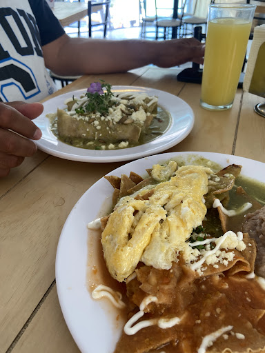 El lugar da una vibra muy tranquila. Yo me pedí unos chilaquiles divorciados con pollo, me ofrecieron café de olla que la verdad esperaba un mejor sabor, no estaba malo pero tampoco era la gran cosa. Los chilaquiles tenían algo que en casa no hay, que eran los totopos comprados, las salsas estaban buenas y estaban bastante bien servidos pero definitivamente se sentían esos totopos comprados. Sin embargo, pedí un almendrado relleno de nutella que me silenció completamente, estaba demasiado bueno. En resumen, es un lugar estándar para desayunar, la ubicación no los favorece para popularizarse pero creo que a los restaurantes si está rica la comida, vale la pena dar la vuelta hasta...