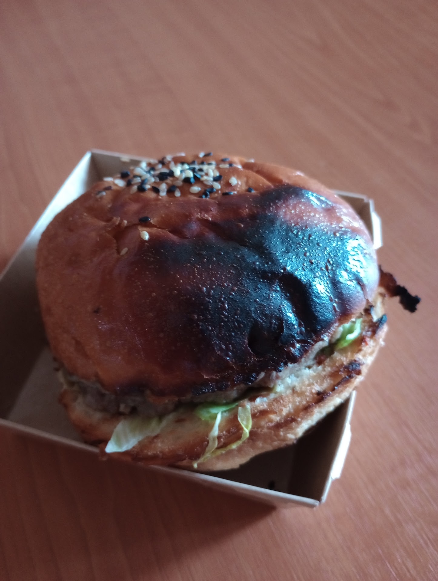 Update! Just when I thought it couldn't get any worse, it did--- my burger wasn't thoroughly cooked; just look at the photos and decide for yourself. I, also in an attempt to make the most out of it since it was quite an amount spent, decided to ignore the burnt burger bun and eat what was left instead, but even that failed to reach its minimal standards! I previously gave 3 stars due to 1) one burger's bottom bread bun being wet and 2) the burnt bun on the other burger, but now that I cannot even eat what's left of my remaining burger here and will have to toss it out and buy something else for food, I'd hate to do this, but you guys are down to 1 star because for the time that I've waited and the amount spent on your "higher-end" restaurant in the center of the city, I should have better results, as condescending as that might unintentionally sound. If you were a fast-food chain and you have a drive-thru driveway and dine-in customers, then I'd understand and it'll be two stars. But it wasn't in such an environment and the atmosphere was much more peaceful as others were munching down their food while I waited patiently for my burgers to be done up to par. I am so disappointed to have to throw out my burger now because I'm hungry still and I don't like to waste food, but at the same time, it was unappetizing enough that I even spat it out!
