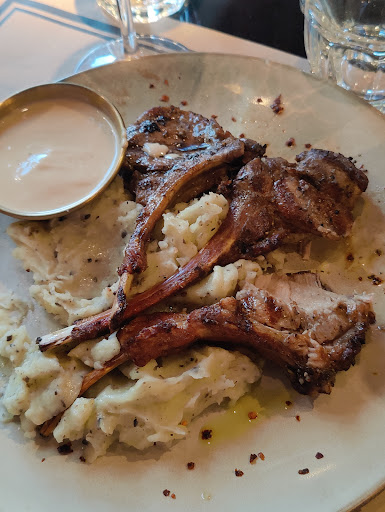 Notable observations: salty potates very chewy lamb chocolate cake with ice cream is way too sweet despite the specialty being meat, this place is still suitable for pescatarians, definitely not suitable for a vegetarian diet (nor does it claim to be, but this might be useful information for others) definitely more suitable for families with children than for quiet dinner (beware: loud children everywhere) small desserts selection the service can be quite slow at times, and the waiter serving us was a bit rude at times, though I think it is because they were understaffed at the time of our visit Nice view to the water and nicely devorated inside Good calf caré Good shrimp salad (although a bit too small of a portion imo) Good Châteaubriant