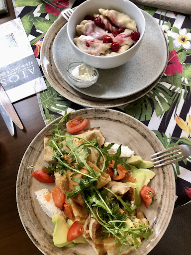 I could give it a five for delicious meal but when you pay such money in a restaurant (the place is pretty expensive comparing it to the spots nearby) you expect a fast and welcoming service, especially when you speak the same language and there supposed to be no barriers in understanding each other. It is pretty weird when you are served sweet meal first, and then you are served main course. The soup and dumplings with cherries were very good. If it comes to croissant and pancakes with salmon — the fish was good, the rest could be better. Our waitress asked if we wanted to have the coffees served right away, we confirmed and got our coffees in...