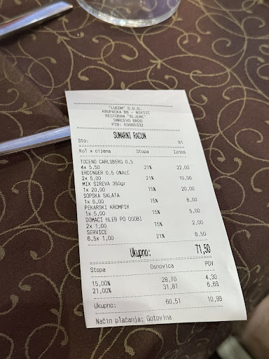 The french fries were frozen and not well prepared. In a country with lots of potatoes and at at "traditional restaurante" this was pathetic. The cevapi seemed to come from another frozen bag, with little flavor. Horrible elevator music that was practically on repeat all night wasn't very enjoyable neither. The service was rather slow, there were at least 3 servers and not many tables. We asked for some kid. Of sauce for the tasteless fries and it took almost 10 minutes to bring it. Many other tables came after us and were served before us. We had 3 plates, nothing strange. 16€ for polenta with cold yogurt was an unreasonable price. 3 big scoops of sticky goop. There is a 10% service charge that's added to the bill. No bread, nothing special...what's this? (Again, we're a table of 4, not 10!)