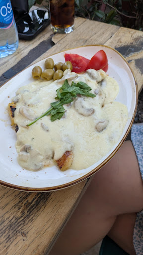 I ordered chicken with mushroom sauce. The meal had no accompanying sides besides 1/2 a tomato (the pictured olives were from the prosciutto plate) The chicken was so dry even the sauce didn't save it.