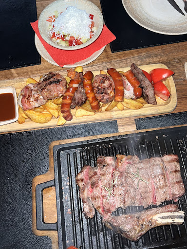 The meat platter came with Pljeskavica, a Balkan minced burger, similar to Cevapi, which had beef, bacon and cheese inside it, it was extremely juicy, creamy, oily and delicious. The platter also had bacon wrapped chicken which was Smokey, tasty, but slightly overcooked. Also, a spicy-red-paprika dominant sausage, similar in taste to chorizo, but with a less salty-more bold/tangy taste- This sausage was a tasty addition. The platter also featured rump steak cuts which were better seared than the rib-eye, but over-cooked to medium. The platter had wedges, tomatoes and hot sauce which were strange accompaniments to meat, but nonetheless, delicious.