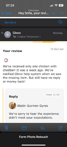 Read moreOrdered here 3 meals, they prepared only 2, took the money for 3 and not even made a refund after several complains. Good place to be cheated. Upd: I'm not making any false provocations, if you're not aware of the answer on the screenshot below then someone is answering to your customers under your name. It wasn't Glovo who prepared the order incorrectly, it's not...