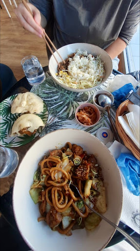 To try we ordered; Steamed Buns! (both pork and chicken) Stir Fried Noodles! (veg(The veggies and tofu in it was sooo tasty)) Spicy Korean Wings with fries! Regular Korean Wings! Rice Bolgogi Pork! (The best pork we ever ate) Taro and Matcha boba!