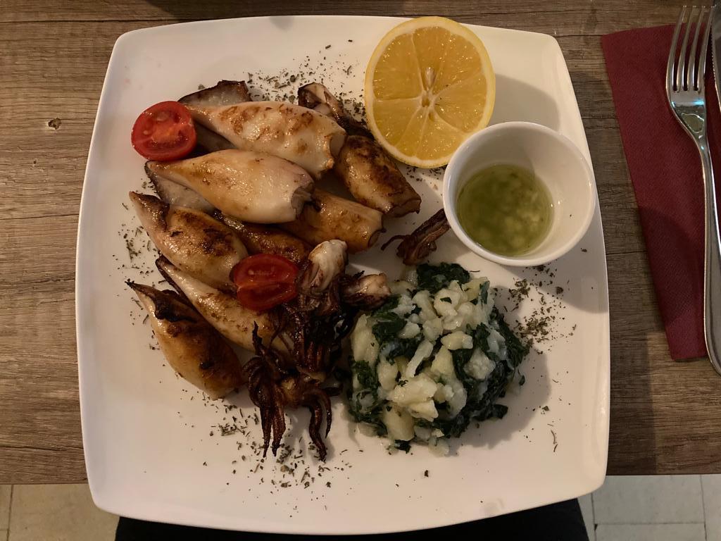 The ambient is very cozy with a bit medieval influence; it is not a huge restaurant but rather middle sized, which I liked. I was there on Saturday evening and there was a duo playing live music. I was afraid of that as I was sure it would be impossible to talk, but the sound system was good and the volume was not extreme! The ourdoor terrace seemed great and I am looking forward to experience it when the weather gets better! Next, the food - it was the best calamari I have had so far. The portion was very big and even when I was starving, I was not able to finish it totally. Upon return 2 days later and the trout was perfect as well. And, one of the best things was their Trilece, I have never had a better one even if it is a simple cake. Not only that, the piece of a cake was huge and easy to share although I did not want to as it was so tasty :))) The food choice is also very diverse - you can find everything from the local specialties to international universal food like pizza or pasta.