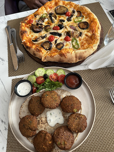 We were warmly welcomed with refreshing orange juice, which felt like a lovely touch. This was followed by appetizers of bread and baba ganoush, both delightful. When our main dishes arrived, the portions were generous, and the flavors didn’t disappoint. The pizza was loaded with toppings, perfectly cheesy, and the falafel was hot, fresh, and delicious.