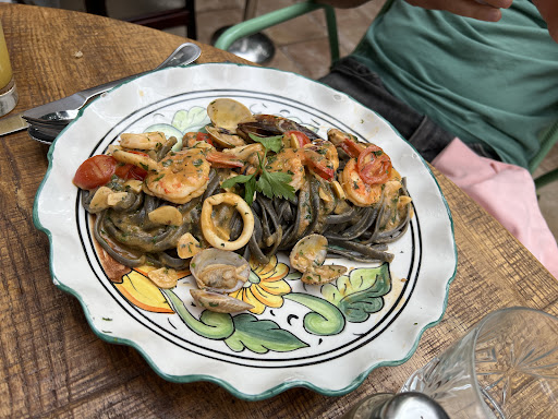 I've been willing to eat here for more than a year, finally today I was able to do so and what a disappointment. The restaurant was actually empty, only 3 tables and despite of that it took them 1h to bring the food because of a misunderstanding at the kitchen. The restaurant is cool, they even have a bar downstairs that we didn't see, but it opens at 19h. The important thing... let's talk about food: The starters were good (despite the burrata pomodoro which is so wrongly prepared with cherry tomatoes). Then we had pizza salmone (tasteless), spaghetti salmone (so tasteless and impossible to eat) and... don't remember what was the exact name, black spaghetti with seafood (seafood was ok, but in genera 5/10, you can eat better anywhere else). Then the dessert. We had panacota and tiramisu, good. Unfortunately I won't be coming back here, at least not for...