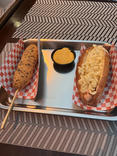 Read more=First picture : ☑️I took a MR.CHEEZDOG British hotdog : it was tasty but the crispy potato chips on top genuinely didn’t have a taste or seasoning on them. ☑️I got a Mr Corndog: it was so so yummy.I highly recommend ! =Second picture : ☑️My friend got a HOT DOG HOT LATINO : it was alright but the hot dog was very chewy. ☑️ the sweet potato corndog was so good. ☑️the jalapeño sauce was so spicy, it felt homemade 👏🏻 = Last picture: Mr.CHEEZSTEAK it was so yummy , cheesy would love to have more seasoning ( a taste of herbs or something like rosemary or origano)