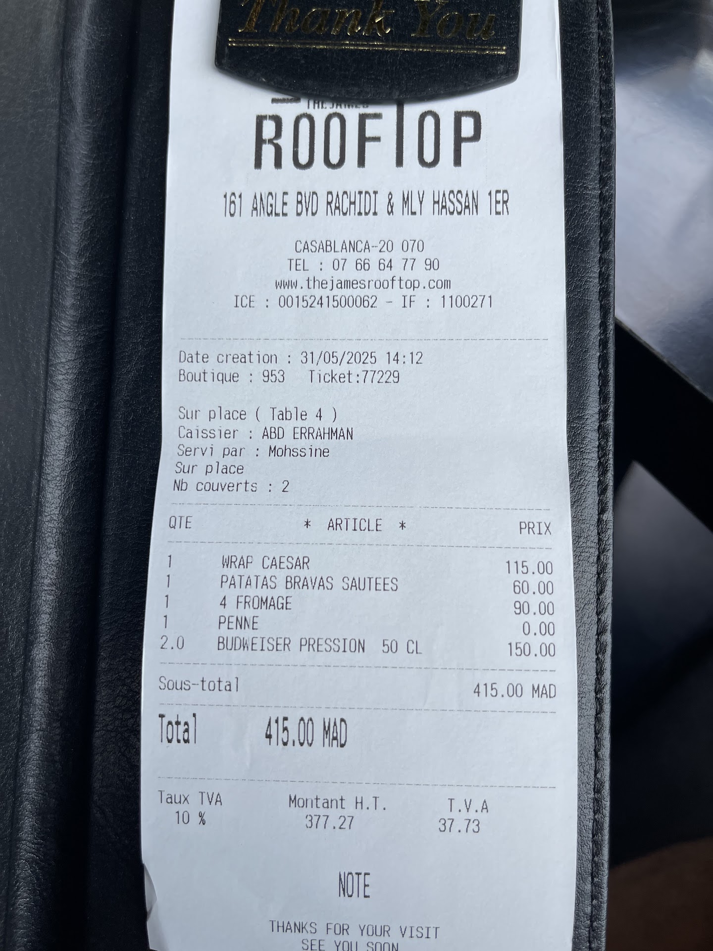 James Roof Top is hands down one of the best spots in Casablanca. From the moment we arrived, the experience was seamless. The management is highly professional, and the staff is incredibly welcoming, attentive, and courteous. You can tell they genuinely care about making sure guests have a great time.