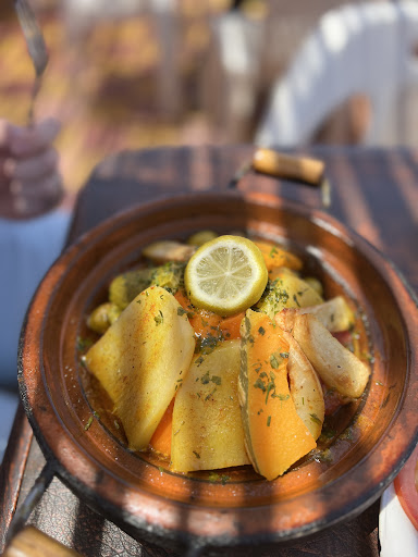 Parking is just a short distance around the corner for just 3 dirhams for however long lunch takes. Hospitable and clean establishment that seems family-run. The salad is great - fresh tomatoes, thinly sliced red onions, and a surprise element of slices of oranges in a perky vinegar dressing with a liberal sprinkling of finely chopped herbs. The soup isn’t so remarkable. A French-style veloute of some kind of root vegetable. We appreciated how everything is under seasoned allowing the diner to season to their own taste. Similarly, tea comes with sugar on the side which is nice for people who don’t want theirs overly sweet. Bread isn’t great- it’s made from processed flour so isn’t substantial and flavorful like other breads we’ve had in Morocco. Olives were briny and great - especially the tiny bits of pickled cabbage here and there. For mains, we had the beef tagine and the kalea, which we ordered because we didn’t know what it was and felt like being adventurous. The beef tagine was tender and flavorful. The way the potatoes were nicely browned and caramelized and soaked up the rich broth was delicious. The kalea turned out to be cubes of chicken breast with diced vegetables and a runny egg in the middle. The chicken was dry but the flavor was nice. Overall a pleasant lunch stopover on the way to the Todra Gorge...