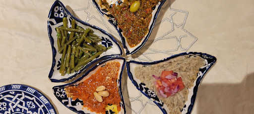 The 4 salad selection was delicious, but then things went downhill. The main courses took over an hour of waiting, the food initially looks good, but we noticed that the tagine dish wasnt hot. Upon forking through the food to find the beef, we realized the beef tagine was mostly caramelized onion with 1 and a half chunk of meat, very small meat portion. When I picked the meat up, the meat was pale in color, did not look like it was cooked in the tagine with sauce. The flavor was very salty, not of good quality, none of the balance of sweet and savory flavor this dish usually has.