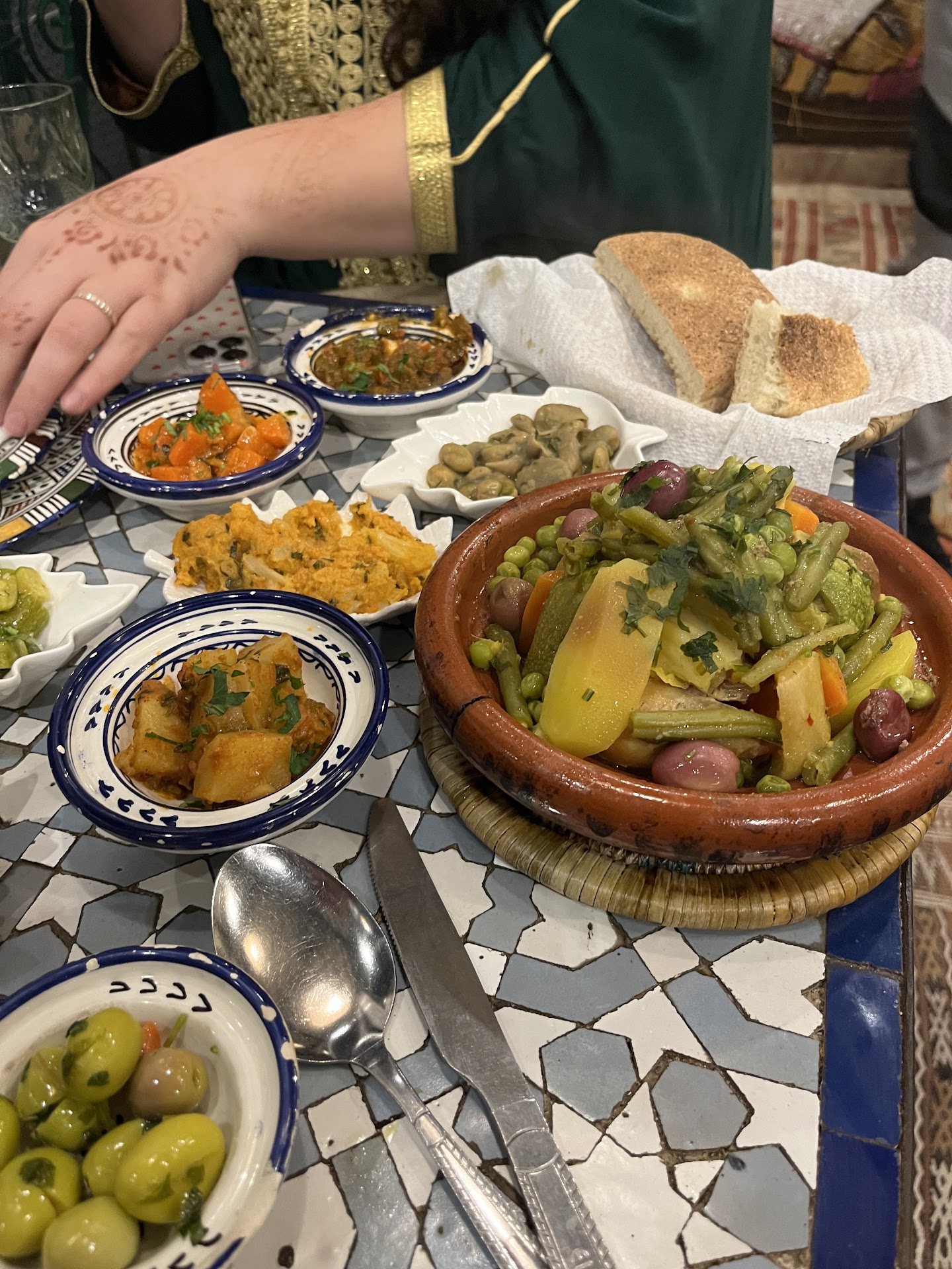Once we got there Adnan (one of the sons) told us they have a guest house and live in the house next door. He and his family run the place with his mother and uncle as the chef and him and his brother and cousins as the servers. It suddenly got very busy and the boys were running up and down the 5 flights of stairs to make sure the guests were comfortable. The starters included in the menu seemed like too much so we only ordered one menu and I’m glad we did. We had so many starters with loads of vegetables in different sauces and salads. The tagine with chicken was also very good seasoned and so tasty. It really felt like being a guest of their family. For desert they had home made pudding. They at first forgot our tea a couple of times but as it was very busy it was understandable and they apologised profusely. They even ended up offering us a discount but since the food was so good and the view and atmosphere was amazing we did not mind one bit. All in all we enjoyed our dinner here and will absolutely...