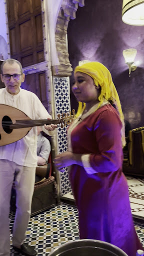 A lute player, percussionist, and singer entertain, playing andalusi and moroccan tunes. At our dinner, we began to clap and all of a sudden the chef was there and we were all dancing and clapping among the tables - greet fun to cap a...