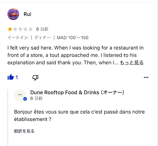 Read moreI felt very sad here. When I was looking for a restaurant in front of a store, a tout approached me. I listened to his explanation and said thank you. Then, when I tried to look at the restaurant next door, he said to me, "Thank you, monkey." I'm not Moroccan, but is that wrong? Did I do something bad enough to be called a monkey? I was clearly a victim of sad racism. I decided to eat at the restaurant so I could write this. Then, when I told the female staff member what he had said to me, she laughed. Is this a funny story?
