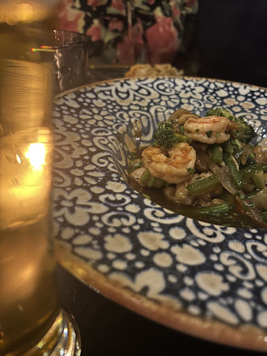 We went to Poka for the last evening of my mom's visit in Marrakech. I made a reservation in advance. The restaurant had a very lovely ambience with dimmed, warm lighting, candles on each table and stylish furniture. Liounge music was playing in the background. Unfortunately the lights were dimmed to a point where one could not read the menu without the help of a flashlight. When we arrived, there was nobody in the restaurant to welcome us and we stood for a few minutes waiting for anyone to arrive from behind the scenes and acknowledge us - even though we were not the only guests. We were then led to a nicely set table and asked for our beverage preference. The service was nice and friendly, however impersonal and unengaged, the order process quick. I was a little disappointed with the food as not only did our Phô soup come out luke warm, there was so much star anis used, it overpowered every other aspects of this fine dish. The spring rolls my husband had ordered also did not come out warm and that took away the feeling of fresh food being served. Taste-wise, the sauteed noodles, pad thai, sushi and green curry were good and overall we enjoyed a nice evening at a good price /...