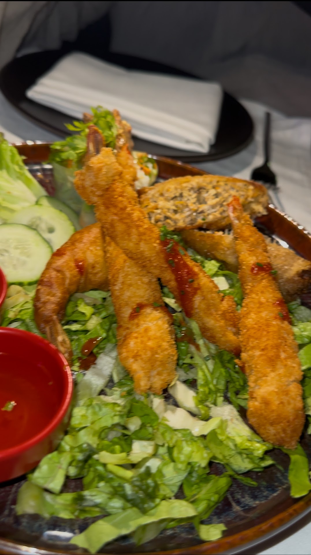 Visited this place on our final night in Marrakech last month and was extremely disappointed to say the least. Initially we were so excited we found this place as the decor is very pretty and the menu looked good but the service was absolutely horrendous. Where do I start? We ordered a mixed starter which came to us cold with wilted lettuce. It was supposed to include 2 of each starter as there was two of us but they only gave us 1 shrimp fritter and 3 shrimp tempuras. I suspected they probably ran out of fritters hence the extra tempura which is not a big deal but I expected this to be communicated to us. I think ant normal waiter would’ve apologised and told us about it. Instead the waiter literally dropped the plate to us and ran off without saying a word. Like he was so busy even though the place was really empty. We told the nice lady at the door who came to check on us that the starters were cold and I guess she informed someone as our mains came over hot so I appreciated that.