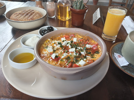 Now, let's talk about the food. I ordered the shakshouka, which was delicious! The dish was served with a generous amount of black olives, cheese, and olive oil, which added a burst of flavor to the already mouthwatering dish. It was perfectly cooked, and the spices used in the sauce were simply divine. Accompanied by a freshly squeezed orange juice and just baked whole wheat bread, it was a meal that satisfied both my taste buds and my hunger.