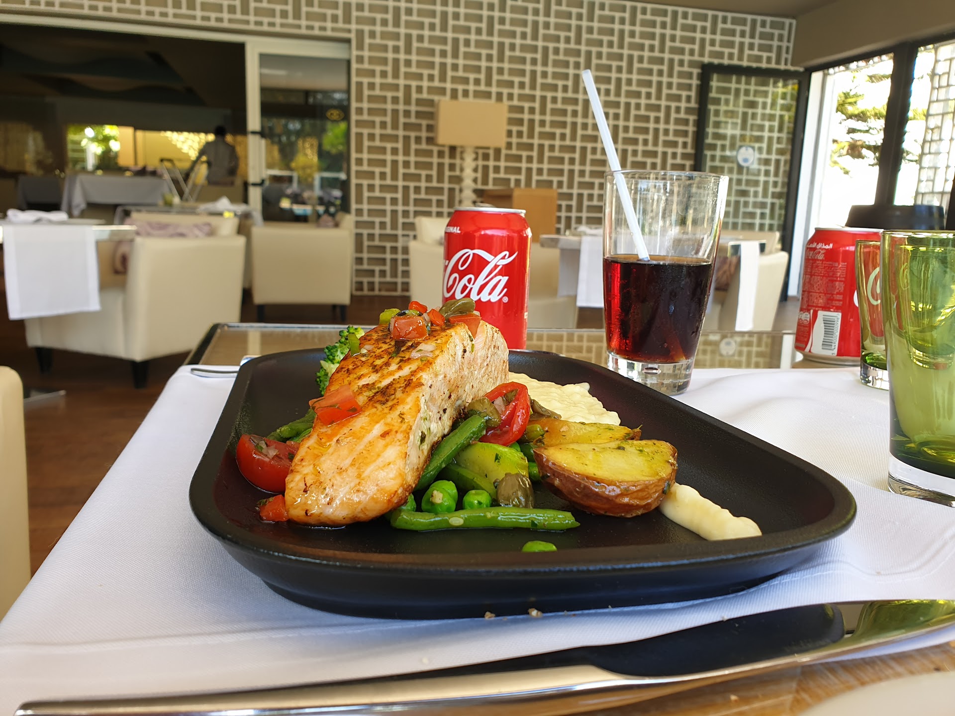 We ordered 4 mojito’s, they were all super bitter. They used schweppes tonic and no sugar at all. When we sent them back to make a real mojito they gave us instead, a mojito mixed with mango lemonade to make it sweet. A restaurant in a 5 start hotel that does not know how to make a simple mojito??? Then, for main dish we ordered the chef’s suggestion swordfish with legumes et puree. The dish was served cold AGAIN! The puree was cold. Back to the kitchen again. Finally a manager came to apologise and gave us 3 more mojito(with mango lol) so in the end we were eating a main dish with 5 mojito’s lemonade served, what a service(!) Also the personnel although kind was very pushy, they started taking away our plates while we were still eating our starter. Ooh i almost forgot, after i had the spew out the ICED seafood balls i never got a new plate. Also my partner did not have a fork to start her maindish. I ate the tenderloin beef which was really good taste and a big portion however the fries served together were a bit undercooked. It sounds like i am really harsh, but it’s the truth. For cherry on the cake when we asked for the bill. The printer is of such bad quality the bill is unreadable. The waiter had to come with a flashlight to shine on the paper so we could read. Later on when he had to put the amount to pay in the machine we had to take over the flashlight to shine on the bill because he could not read it..