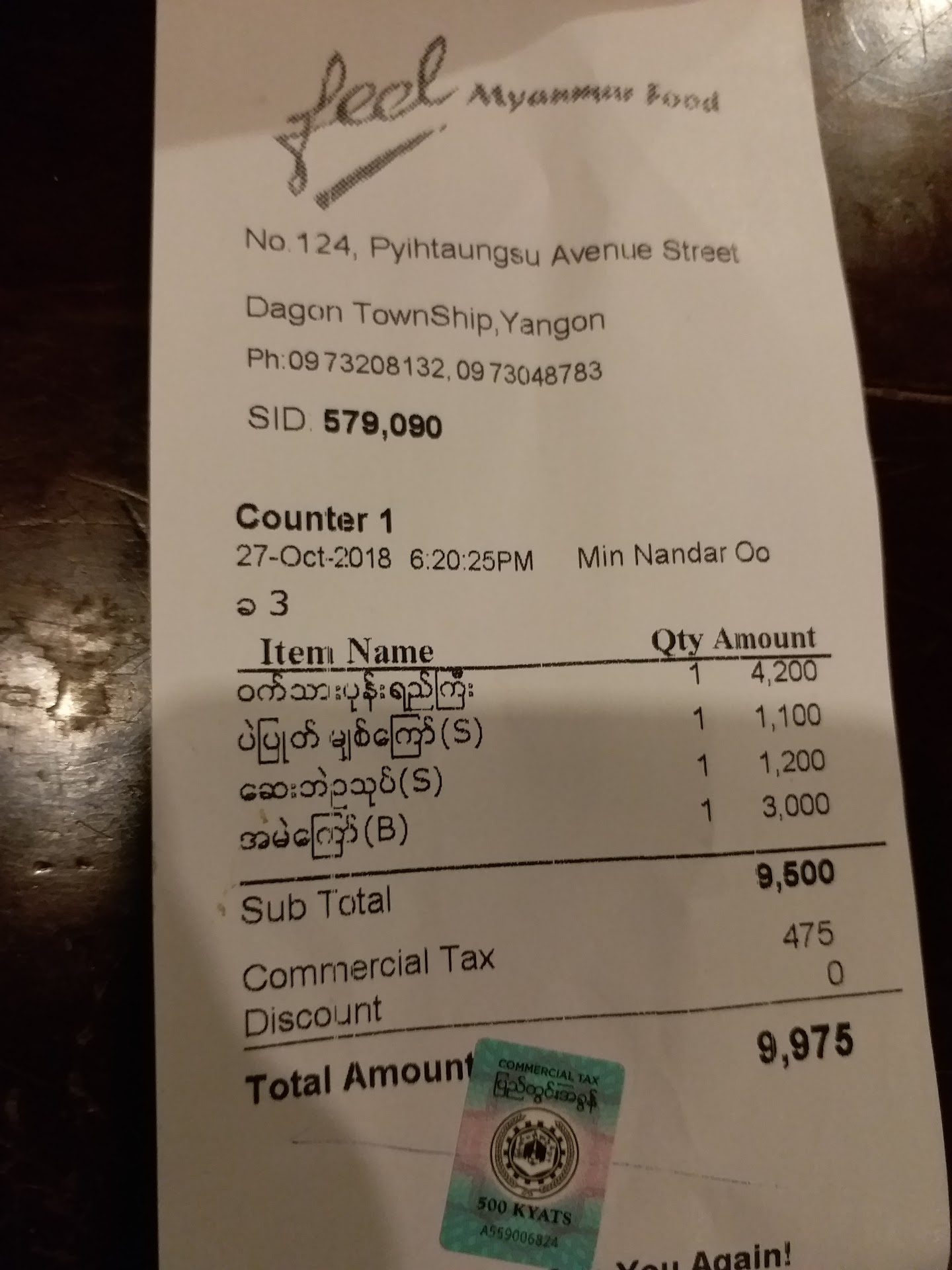 The total cost for the meal was K10,000. Similar meal at other places in Myanmar, like in Mawlamyine, can be for about half the price. This price is a little high for Yangon, reasonable price should be K6000.