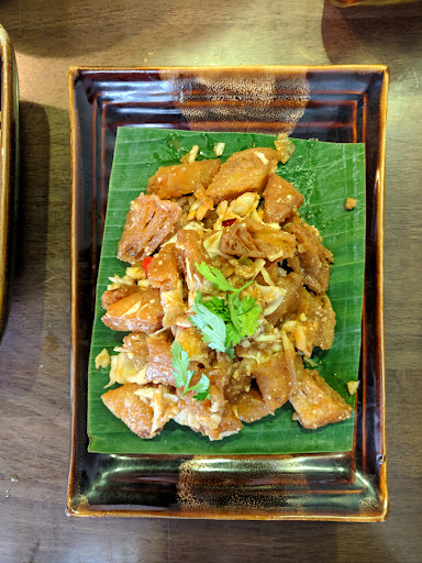 Looked on Trip Advisor and the place was #4 out of many many restaurants in town. Plus it was Shan cuisine, which we wanted to try. We gave it a go. Well, we shouldn’t have. I ordered a tea leaves salad, their top notch dish. They were out of it. Plan B, another salad with fresh leaves of a local plant. They were out of it. The waiter then advised a salad of some pickled vegetable. I said ok. I added Shan noodles as my main, the dry ones, not the soup. My partner ordered some fried pork starter. They were out of it. Three dishes they were out of and it was barely 8:00 PM. He then took a dish of chicken in banana leaves and some sticks of fried sticky rice and sesame. My salad was... bad. With crunchy stuff that I suspected were coated peanuts. My noodles looked and tasted liked ketchup spaghetti, only a tiny bit more spicy. The sticky rice had no taste. Really, no taste at all. And the meat in banana leaves was some smushy omelette looking thing, almost shiny to the surface. As drinks we had a juice and a tea. I felt heavy when we left the place and by the time we got back to the hotel, I got sick. Total check of 8.40 USD. While the food was worst than what you could eat in some forsaken restaurant at the top of a bad ski resort, at least it was not a pricey...