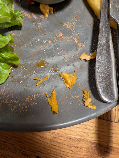 Whilst I'm halfway through, I nearly choked on these scraps which I believe are shavings of bone but the guy tells me it's chicken 🤨 ok. (Pictured) The only reason the guy was at our table in the first place is because he was delivering the burger... Again... Which I was halfway through eating. Turns out, it was meant for another table that had all eaten their food bar from one poor soul who was still awaiting his burger even though all his pals had ate their meals.