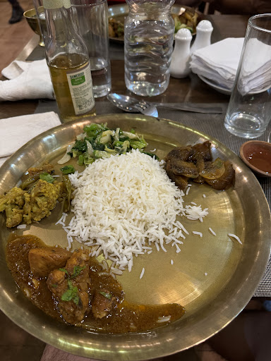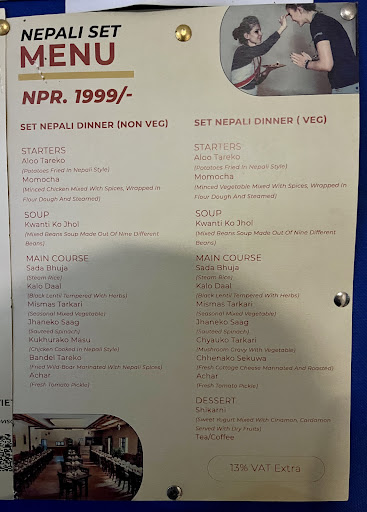 Read moreIt’s dinner and a show at Bhojan Bhumi! Not only do they feature a cultural program with traditional dances, they also offer a multicourse Nepali meal with appetizers, mains, desserts, and drinks! The meal started with a basket of popcorn and a very strong rice wine poured into an overflowing ceramic ramekin. The appetizers included Aloo Tareko (fried potatoes), Kwanti Ko Jhol (a soup made of 9 different beans), and my favorite, 3 Momocha (steamed dumplings with minced chicken). But the highlight of the meal was the main course served on a metal thali by an army of waiters dishing out each of the components individually with unlimited helpings of everything! The thali centered on Sada Bhuja (white rice) and a cup of Kalo Daal (black lentil soup). The vegetables included Mismas Tarkari (spiced cauliflower, green beans, potatoes) and Jhaneko Saag (sautéed spinach). The two meat dishes were Kukhurako Masu (bone-in chicken in a spiced curry) and my favorite, Bandel Tareko (fried spiced strips of wild boar with peppers and tomatoes). Finally, a dollop of Achar (tomato chutney) acted as a sweet, tangy, spicy condiment to enhance the flavors of all the other components. Of the mains, I was especially a fan of the Kalo Daal, Mismas Tarkari, Jhaneko Saag, and Bandel Tareko, but everything was flavorful and delicious. Finally came a dessert of Shikarni (mango-flavored yogurt), a lightly sweet and tangy finish to an incredible meal. But it wasn’t just the food and performances that made eating here such a memorable dining experience—the service was extraordinarily friendly and hospitable and was super attentive to...