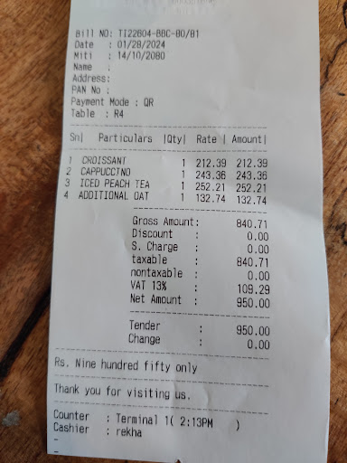 My lactose intolerant friend ordered a Oat milk Cappuccino. But as you can see on the bill, Himalayan Java charged us for both the Cappuccino and the Oat Milk. The Oat Milk is listed as "extra".