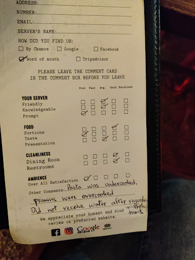 Read moreBeen here a lot of time and love the food and ambience.Nothing beats smoked chicken hawaiian pizza with added sun dried tomatoes.Also love their passionfruit mocktail and negroni . No disappointments really besides their lasagna using beef meat , mind you not even buff but beef(thats what the chef told) .It would be great to have chicken option in lasagna .The other time i was disappointed was when i ordered bucatini arabiata and i clearly said make it in penne and gave clear instructions to waitress twice. I thought bucatini was another name for spaghetti or part of the name of the sauce. She actually got me and knew i meant penne in arabiata sauce but still bought it in spaghetti or bucatini and said "bucatini is itself a pasta .i took your order and you said bucatini" like she was trying to teach me a lesson on how to order your food properly😆 . But now Its really funny how they updated their menu with bucatini arabiata penne and bucatini arabiata spaghetti .Anyways ...