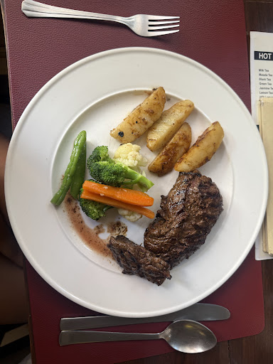 However this place is supposed to be known for steaks, the quality of the meat was hard to say and tough to chew through. It had to be sent back to the kitchen to cook longer from the original order (ordered medium, came out blue Rare)