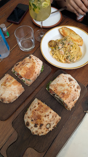 Food and Ambience: I am a big fan of italian food so we ordered the Lemon Scampi Shrimp Pasta, Pulled Chicken sandwich and Toasted Dojima Roll for dessert. • Lemon pasta: I cannot understate how good this dish is, it is so unique!😍 The lemon butter sauce coats the velvety pasta and has such a citrus-y and a spicy kick to it from the chili flakes. The parsley adds a hint of freshness, i absolutely love it! Highly recommended! 🤤 • Pulled Chicken Sandwich: I was fond of the style of the dish, they're Panuozzo-styled. The bread was firm and nicely toasted and filled with chicken, charred tomatoes, and basil mayo if im not mistaken, alongside greens. Each bite is balanced and the ingredients don't overpower each other. It's a good snacking choice, it gets you pretty full!😋 We got a complementary Roasted vegetable sandwich alongside it as a complementary item, and it tasted as good as the other one. The vegetable selection was lovely and they did a good job with charring each of them, it really enhanced the flavours when mixed with the basil mayo. For a veggie sandwich, i'm impressed.👍 • Toasted Dojima Roll: Really a nice way to end it. The bread is soft, light, and toasted which is contrasted nicely with the smooth custard cream that is sweet alongside a chilled scoop of ice-cream. Harmonious when tasted all together. The thin slices of grapes is a subtle, but noticable touch in terms of both taste and presentation of the dish! I recommend this!😋
