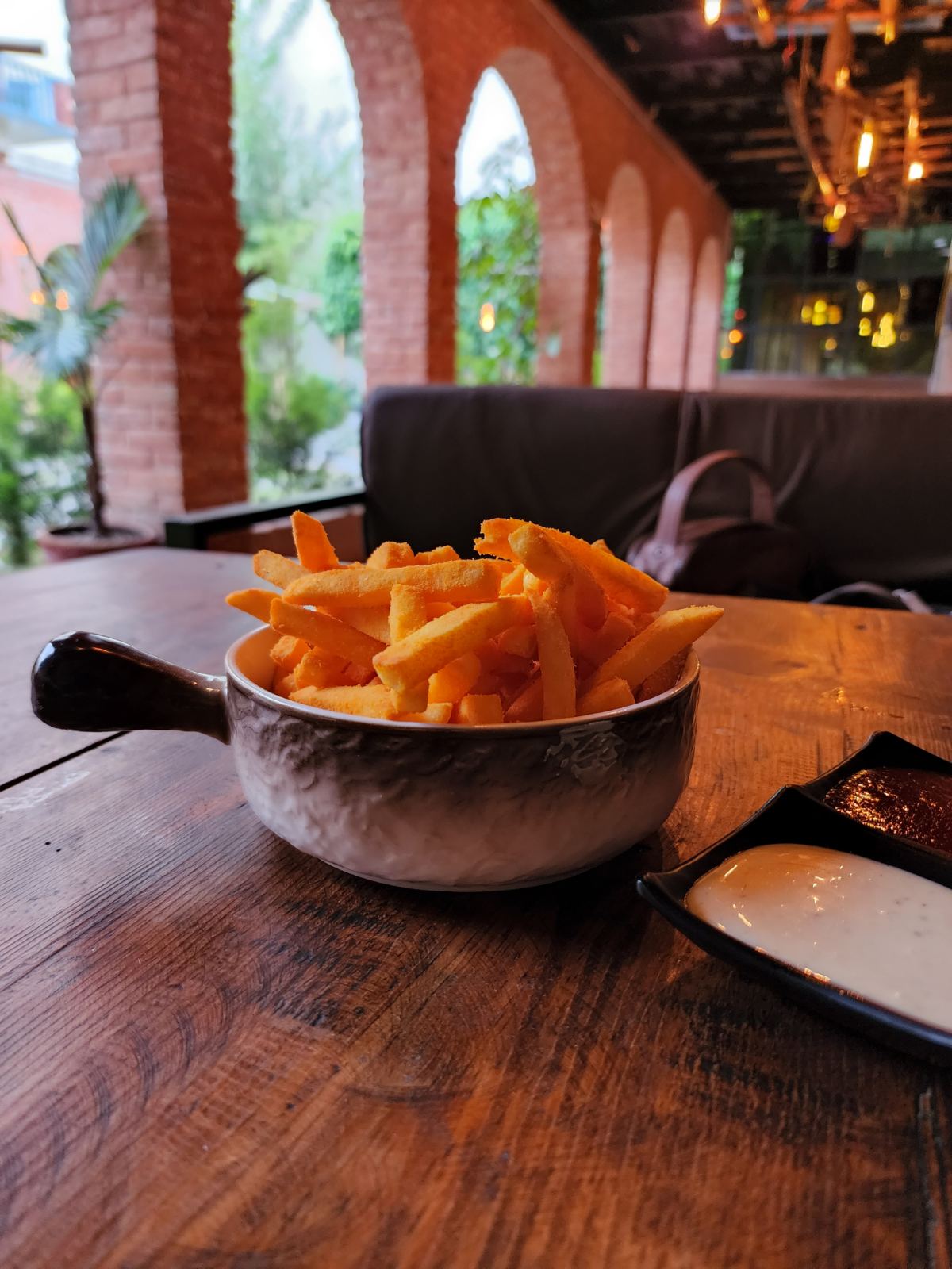 On the food part, there wasn't alot on the menu. We ordered cheesy fries, spaghetti carbonara- chicken and chicken C momo. Cheesy fries ⭐⭐⭐ loved the crockery Spaghetti carbonara -chicken ⭐⭐ cheesy but with no taste Chicken C momo ❌ it was dreadful