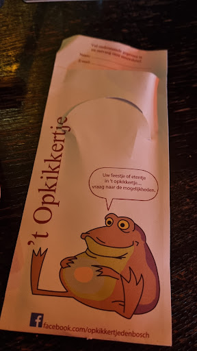 We liepen hier naar binnen vanwege de menu kaart die veel verschillende mogelijkheden bood. Op deze dag was er voor de ingang een soort overdekt terrasje gemaakt van zeilen om uit de wind te zitten. De zeilen waren doorzichtig, dus je kon hierdoor nog leuk op het marktplein uitkijken. Wijzelf vonden het iets te fris buiten, dus liepen direct naar binnen. Het is er binnen niet heel ruim, redelijk smal en er zijn op de begane grond niet veel tafels en zitplaatsen beschikbaar. Blijkbaar is er ook nog een 1ste etage met zitplaatsen en bevinden zich daar ook de toiletten. Deze etage hebben wij niet bezocht. Een trap naar de kelder komt uit in de keuken van deze gelegenheid. Bij binnenkomst werden we direct erg enthousiast en vriendelijk welkom geheten, ondanks dat ze erg druk waren. We arriveerden dan ook precies rond lunchtijd. Nadat we op de begane grond aan een tafel gingen zitten, zagen we pas de grote hoeveelheid kikker beeldjes, bordjes etc. Verspreid over de wanden, bar etc. Niet zo gek met zo'n naam voor je gelegenheid en daarbij is de kikker ook nog eens de mascotte tijdens de Oeteldonkse carnaval hier. Leuk, geeft toch wel een extra sfeertje. Je moet ervan houden, maar wij konden het wel waarderen. Op de menukaart stonden diverse keuzes voor ieder wel wat denk ik. Er stonden ook wat luxere gerechten en broodjes op, die je niet zo snel in een doorsnee eetcafé ziet. Interessant, want of je bent erg ambitieus of je kunt dit gewoon goed aan. Omdat ik vaker ben verrast door kleinere gelegenheden die juist veel aandacht schenken aan hun aangeboden kaart, wilde ik dat hier ook wel eens proberen. Zelf ging ik voor een luxe broodje Angus Beef burger en mijn partner ging voor de zalm wrap. De rijk gevulde zalm wrap was wat simpel doormidden op een bord gelegd, maar mijn burger was leuk gepresenteerd met wat sla en entourage er omheen. Vooral de smaken en de wat mij betreft precies uitgemikte verhouding kaas, bacon, beef etc, heeft mij zeker doen genieten van deze burger. Niet druipend van het vet, erg smaakvol en geen smaak overheerste. Mijn partner vond de wrap "erg lekker". Zelf heb ik ook nog een speciaal biertje erbij genomen waarvan ze er 4 op de tap hebben en nog meer keuze op de fles. Fijne lunch, de porties waren voor ons beide voldoende en de prijs was naar verhouding en persoonlijk vond ik dat niet duur. Zeker voor...