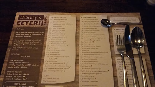 Onze eerste keer bij Danny's Eeterij . Wat een verwennerij! Ècht genoten! Super lekkere, kleine tapas gerechtjes, goed bereid, smaakvol , vers , goed warm , ontzettend vriendelijk én hardwerkend jong personeel, alles prima onder controle zowel de keuken als de bediening! Knap hoor ! Leuke , schone, nette zaak , fijne stoelen , de Tapas worden snel geserveerd. Toiletten zijn netjes. Wij waren blij verrast, zijn best kritisch als het om eten gaat , maar bijna alles was lekker! Vooral de beef black pepper , de witvis Teriyaki, de Oosterse gerechten met beef / vis , het speklapje is smullen, de gamba op spies , de combi zalm met forel , de krokante sushi , tongfilet , Poké bowl, allemaal super lekker , enige wat wij wat minder vonden was de varkenshaas met champignon saus , maar dat is in ieder tapas restaurant. Altijd beetje droog . De broodjes met aïoli zijn top ! En de toetjes zijn óók allemaal even lekker !! Vooral de monchou én ijs met warme kersen ! Je zit er heerlijk comfortabel, avondvullend tapas avondje , zalig ! Gratis parkeren, Je komt niks tekort , Écht voor herhaling vatbaar !...