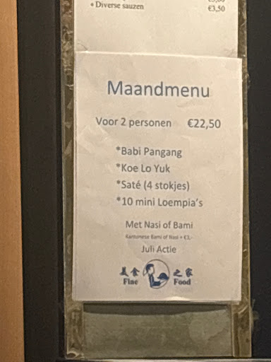 Read moreMaandmenu voor twee en gebakken banaan was de keuze. En, smaak, hoeveelheid, geur en kleur, met een woord , fantastisch. De , waarschijnlijk, zoon van de eigenaar nam de bestelling op. Uitermate vriendelijke jongeman en zelfs tijd voor een praatje. Enige, persoonlijke kritiek, de sauzen van de foe yong hai en babi pangang waren wat aan de dunne kant....