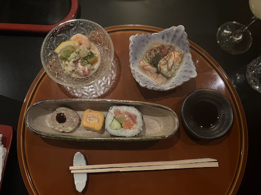I would give the dining experience here a 4 star in general, but the food itself is a 3/5. I came here with more expectation that what it is. We ordered a tsuki menu with 6 courses menu, came home with a full stomach. Talking about the flavor, it is kinda decreasing over each course. The starter with three small dishes gave a good refreshing taste and introduction to Japanese cusine. Next is sashimi, fresh and flavorful. Then we get baked fish (dorado) in sweet soy sauce I think. This is okay but a bit overlap in flavor with the final main dish (beef with teriyaki sauce) also a sweet soy sauce with mirin & sake. This is where I think they can do something better in arranging the dishes. Tempura between fish and meat dish is not bad. Desserts with houjicha panna cotta, a small scoup of matcha ice cream, red bean pudding cake and some thinly sliced fruit is not really balanced after some steak with teriyaki sauce. The panna cotta is not that good yet the roasted tea flavor is there, ice cream okay but pudding cake a no. Overall I would say everything is still there but they do not really reach their maximum capacity... All the staff lady are really nice taking care of all the guests, love this! P/s some wine there are outstanding, yuzu shu and ume wine are top choices, good paring...