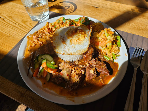Helaas wat een teleurstelling deze keer.... De Rijsttafel Bandung was wel heel lekker op de nasi goreng na voor €1,75 extra. Geen enkele toevoeging op ketjap manis na, waardoor je een donkere nasi kreeg. Had óók een hoop bijgerechten erbij besteld, wat eigenlijk de grootste teleurstelling teweeg bracht..... telor belado, 2 hardgekookte eieren in een pikante sambal saus voor € 3,00 pisang goreng, 5 stuks, ca 10cm, in een rare gladde en smakeloos beslag voor €4,00. saté kambing, 3 stokjes lamsvlees, in een lekkere dressing, maar helaas zó droog en doorbakken dat je het bijna niet van de stokjes kon scheiden én gewoon niet te kauwen waren én dat voor €6,60. 2 loempia's Waren per stuk nog kleiner als een Vietnamese uit een pakje van de Lidl of zo..... Zeker geen zelfgemaakte en dat voor €2,20 per stuk. gado gado Acceptabele portie, maar helaas zó droog, dat je water moest toevoegen om het eetbaar te maken én dat voor €8,00. nasi rames, Zelfde verhaal.....alléén met het verschil dat er bijna geen vleesgerechten of buiten de witte rijst andere toevoegingen waren én dat voor €12,50.