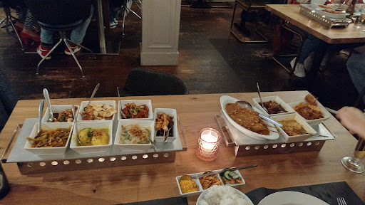 Helaas wat een teleurstelling deze keer.... De Rijsttafel Bandung was wel heel lekker op de nasi goreng na voor €1,75 extra. Geen enkele toevoeging op ketjap manis na, waardoor je een donkere nasi kreeg. Had óók een hoop bijgerechten erbij besteld, wat eigenlijk de grootste teleurstelling teweeg bracht..... telor belado, 2 hardgekookte eieren in een pikante sambal saus voor € 3,00 pisang goreng, 5 stuks, ca 10cm, in een rare gladde en smakeloos beslag voor €4,00. saté kambing, 3 stokjes lamsvlees, in een lekkere dressing, maar helaas zó droog en doorbakken dat je het bijna niet van de stokjes kon scheiden én gewoon niet te kauwen waren én dat voor €6,60. 2 loempia's Waren per stuk nog kleiner als een Vietnamese uit een pakje van de Lidl of zo..... Zeker geen zelfgemaakte en dat voor €2,20 per stuk. gado gado Acceptabele portie, maar helaas zó droog, dat je water moest toevoegen om het eetbaar te maken én dat voor €8,00. nasi rames, Zelfde verhaal.....alléén met het verschil dat er bijna geen vleesgerechten of buiten de witte rijst andere toevoegingen waren én dat voor €12,50.