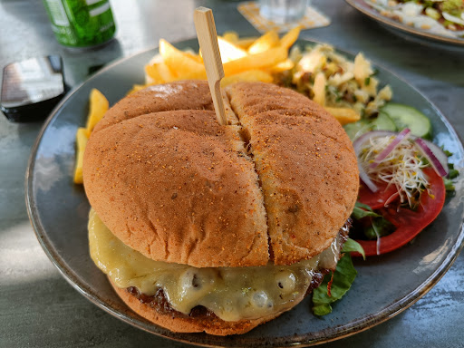 Read moreHet logo van dit restaurant bevat een kroontje en dat is verdiend. Lommerrijk terras en een serre. Restaurant zeer sfeervol ingericht met o.a hoogzittafels en prima zitcomfort. Mooie loungebank en grote leestafel. Voor ons vormde deze pleisterplaats het einde van een lange, warme etappe van Het Pieterpad. We vroegen daarom een glas water bij de huiswijn en de vriendelijke ober die zag dat de inhoud snel verdween, bracht meteen een tweede glas. Na corona maakt de horeca een inhaalslag en dat is terug te lezen in de prijzen. Maar in dit geval was de prijs-kwaliteitverhouding prima. Dat gold voor de schotels: hamburger (knapperig geroosterde bol) en...