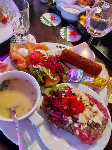 Dat is wel een beetje onnozel van mij. Eerst mân bord helemaal leeg eten en dan denken oh ja een foto voor de review đ Maar aan de andere kant een leeg bord is een goed teken. Het 12 uurtje met mosterdsoep maar je mocht ook tomatensoep nemen. Keuze dus. Bruin oerbrood met zalm en salade topping, uitstekende kroket op witbrood. En dat voor 17 euro. Normaal krijg je een klein kopje soep maar hier kregen we een volwaardige kom mosterdsoep met spekjes! Als Groninger in Friesland werd ik helemaal gelukkig. Gemoedelijk sfeer bij de bediening en een schitterend toilet! Het rook gewoon nieuw! Ja een heerlijke lunch na afloop lekker handjes wassen met een goed ruikende zeep. Voldaan het dorp in. âBest genoghâ zo zeggen ze dat geloof ik...