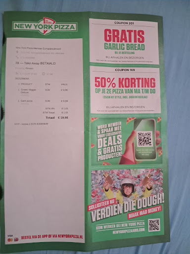 Om 17:30 de bestelling geplaatst. Tijdstip van levering was beloofd om 18:00. Om 18:31 de klantenservice gebeld met de vraag of de pizza's nog kwamen. Om 19:15 nog steeds geen pizza's ontvangen. Nogmaals de klantenservice gebeld die mij doorverwezen met het desbetreffende filiaal. Daar kon er niks voor ons betekend worden en werd het simpel weg gewuifd met een kort excuus. Nooit eerder zó lang moeten wachten (80 minuten na beloofde leveringstijdstip..!!) op een bestelling. Ook nooit eerder de moeite genomen om een dergelijke recensie te schrijven maar dit was te triest voor woorden. De eerste en beslist laatste bestelling bij New York Pizza.