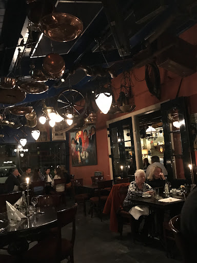 The restaurant is decorated with lots of neat things on the wall and on the ceiling. Above me were a whole bunch of pots and pans. Above the bar were some brass musical instruments like trumpets, tuba...