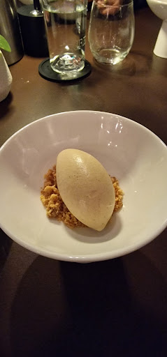 Het meest spannende gerecht was de afsluiter: dropijs met structuren van mandarijn. Op het eerste gezicht een onmogelijke combi, maar het werkt! Fris, tikje salmiak, lekker! Er bij werd een Gloria de Moya geschonken die prachtig samen ging met de drop.