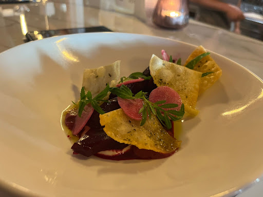 I did not have the chef’s menu- this seems to be the popular choice. My wife and I ordered a la carte and I was not impressed. We ordered the Sourdough with olive oil and maldon sea salt and she had the Grilled Aubergine to start. The sourdough bread was a dense and darker style loaf (not my favourite and not what I expected) The portions were generous but the portion of olive oil did not match the quantity of bread and the tiny dipping bowl it came in made it difficult to dip. On the same plate as the bread serving was a strange addition- with a texture like butter - but it wasn’t. My initial guess was it was some type of Mediterranean spread like taramasalata, I tried a little and it was horrible, with a consistency of aerated margarine with little taste. I stayed well clear of that. My wife enjoyed her starter. For the main course I had the smash burger - to be honest it looked like the chef misunderstood the idea of what a smash burger is, instead interpreting it by squashing both the burger and the bun into a decidedly flat affair with no height. But it tasted good and the portion was generous. My wife ordered a Beetroot salad, she noted that one of the main ingredients - blueberries, was missing. Desert was a deconstructed cheese cake - overly sweet but nicely plated.